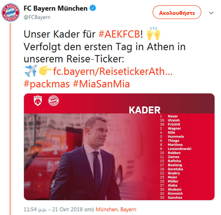 Αναλυτικά η αποστολή της Μπάγερν, η οποία αναχώρησε σήμερα το πρωί από το Μόναχο: Νόιερ, Ούλριχ, Φριχτλ, Βάγκνερ, Ζίλε, Χούμελς, Τιάγκο, Μαρτίνες, Λεβαντόφσκι, Ρόμπεν, Χάμες, Ραφίνια, Μπόατενγκ, Γκορέτσκα, Γκνάμπρι, Μάιερ, Μίλερ, Αλάμπα, Σαμπάνι, Κίμιχ, Σάντσες.