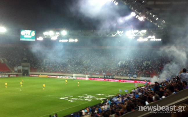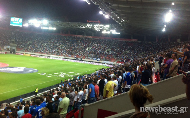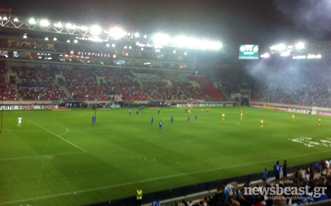 Υπέροχη ατμόσφαιρα δημιουργούν στο γήπεδο Καραϊσκάκη οι 15.000 θεατές που βρίσκονται στις εξέδρες, ενώ όλο και περισσότερος κόσμος μπαίνει στις κερκίδες.