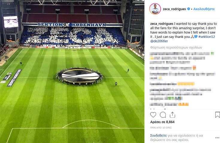 Τη στήριξή τους στον Κάρλος Ζέκα, που είχε αποβληθεί στο εκτός έδρας παιχνίδι με την Μπορτόν, έδειξαν οι οπαδοί της Κοπεγχάγης. Ο αρχηγός της ομάδας είχε αποβληθεί, όταν πήγε να πανηγυρίσει το γκολ της νίκης στα κάγκελα αγκαλιά με τους Δανούς οπαδούς. Ο πρώην άσος του Παναθηναϊκού βρέθηκε εκτός για το παιχνίδι με την Σλάβια Πράγας, με τους υποστηρικτές της Κοπεγχάγης να δημιουργούν κορεό με το όνομά του. Ο μέσος της Εθνικής ανέβασε φωτογραφία στο Instagram και έγραψε σχετικά: «Ήθελα να ευχαριστήσω όλους τους φιλάθλους μας για αυτήν την καταπληκτική έκπληξη. Δεν μπορώ να περιγράψω με λόγια ο,τι ένιωσα την ώρα που είδα το κορεό, γι’ αυτό το μόνο που μπορώ να πω είναι απλώς ευχαριστώ».