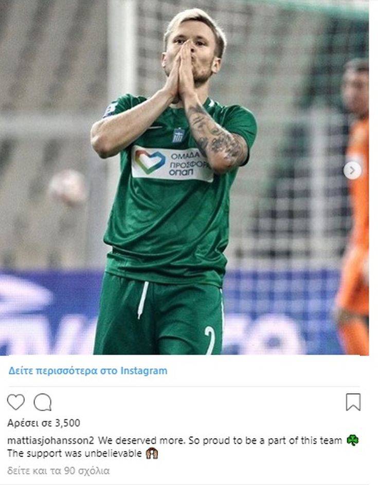 Η ισοπαλία με την ΑΕΚ δεν ικανοποιεί τον Γιόχανσον. Ο Ματίας Γιόχανσον έγραψε στο λογαριασμό στο instagram μετά το ματς με την ΑΕΚ: «Αξίζαμε περισσότερα. Τόσο υπερήφανος που είμαι μέλος αυτής της ομάδας. Η υποστήριξη ήταν απίστευτη».