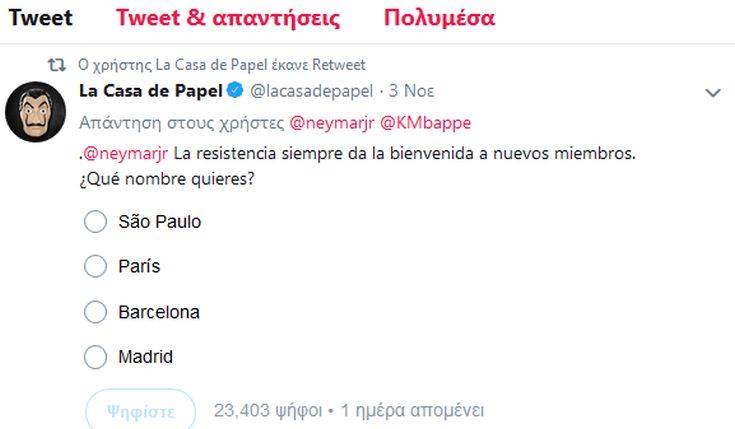 Έτσι, οι δημιουργοί του Casa de Papel, πρότειναν στον Βραζιλιάνο άσο της Παρί Σεν Ζερμέν να πάρει μέρος, διαλέγοντας ως ψευδώνυμο ένα από τα Σάο Πάολο, Παρίσι, Βαρκελώνη και Μαδρίτη.