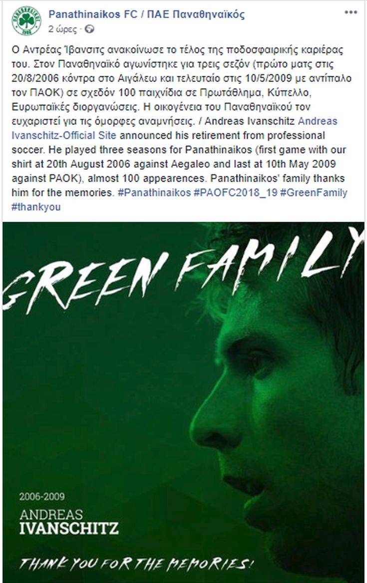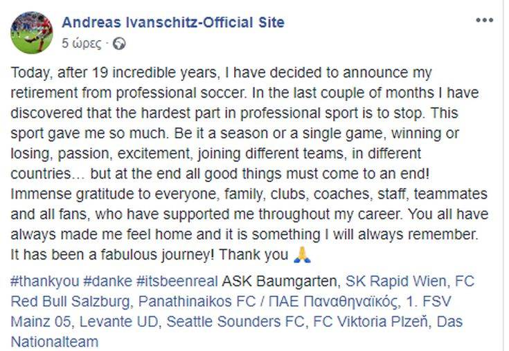 Την απόφασή του να αποχωρήσει από την αγωνιστική δράση μετά από 19 ολόκληρα χρόνια ως ποδοσφαιριστής σε επαγγελματικό επίπεδο, ανακοίνωσε ο Αντρέας Ίβανσιτς. Μέσω ανάρτησης στο Facebook, ο «μαέστρος» του αυστριακού ποδοσφαίρου, ευχαρίστησε όσες ομάδες φόρεσε τη φανέλα τους αυτό το διάστημα (εννοείται και την εθνική Αυστρίας), μεταξύ των οποίων ήταν και ο Παναθηναϊκός. «Σήμερα, μετά από 19 απίστευτα χρόνια, αποφάσισα να αποσυρθώ από το ποδόσφαιρο. Τους τελευταίους μήνες κατάλαβα ότι ένα από τα πιο δύσκολα κομμάτια του επαγγελματικού ποδοσφαίρου είναι η απόφαση να βάλεις τέλος. Το άθλημα μου έδωσε πάρα πολλά. Είτε ήταν μια σεζόν, είτε ένα παιχνίδι, είτε μια νίκη, είτε μια ήττα, το πάθος, ο ενθουσιασμός, οι διαφορετικές ομάδες, οι διαφορετικές χώρες… Όλα τα καλά, όμως, έχουν κι ένα τέλος. Είμαι ευγνώμων προς όλους, την οικογένειά μου, τους συλλόγους από τους οποίους πέρασα, τα επιτελεία με τα οποία συνεργάστηκα, τους συμπαίκτες μου και φυσικά όλους τους οπαδούς που με στήριξαν όλα τα χρόνια της καριέρας μου. Πάντοτε με έκαναν να αισθανθώ σαν στο σπίτι μου και αυτό είναι κάτι που θα θυμάμαι. Ήταν ένα υπέροχο ταξίδι, σας ευχαριστώ…», σημείωσε στην ανάρτησή του ο Ίβανσιτς.