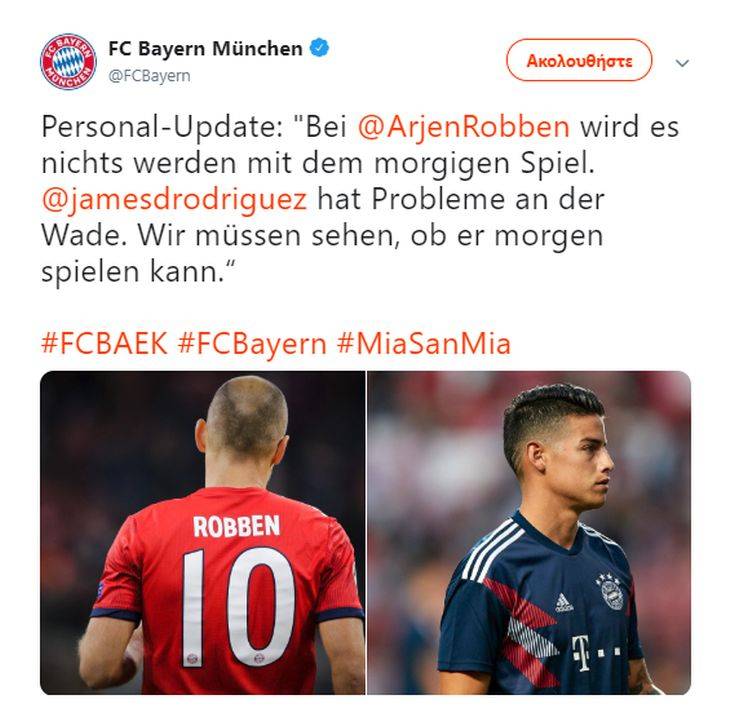 Τα δύο σερί σημαντικά παιχνίδια με «κιτρινόμαυρους» είναι αυτά που βρίσκονται στο προσκήνιο για την Μπάγερν Μονάχου, η οποία αύριο κοντράρεται με την ΑΕΚ για την 4η αγωνιστική των ομίλων του Champions League και το προσεχές Σάββατο με την Ντόρτμουντ, για την Μπουντεσλίγκα. Τόσο ο Νίκο Κόβατς όσο για Τζόσουα Κίμιχ, στη συνέντευξη Τύπου ενόψει του αγώνα της Τετάρτης με αντίπαλο την Ένωση, τόνισαν ότι αυτό που προέχει είναι η κόντρα με την πρωταθλήτρια Ελλάδας και στη συνέχεια το παιχνίδι που θα κρίνει πολλά για τον τιτλο πρωταθλήματος, κόντρα στους Βεστφαλούς. Ο Κροάτης τεχνικός δεν θα έχει στη διάθεσή του τον Άριεν Ρόμπεν, όπως και τον Τιάγκο Αλκάνταρα, οι οποίοι -σύμφωνα με τα δημοσιεύματα των τελευταίων ωρών- περιλαμβάνονται μεταξύ των τεσσάρων που θέλουν το «κεφάλι» του, ενώ ο ίδιος τόνισε πως κόντρα στην ΑΕΚ περιμένει ένα δύσκολο ματς, όπως αυτό της Αθήνας. «Είναι σημαντικό ματς για εμάς. Έχουμε την ευκαιρία με νίκη να πιάσουμε τους δέκα πόντους. Μπορούμε ακόμα και να προκριθούμε από αύριο. Ξέρω πόσο σημαντικό είναι το ματς που ακολουθεί με την Ντόρτμουντ, αλλά επικεντρονώμαστε στην ΑΕΚ. Φυσικά και δεν παίζουμε καλό ποδόσφαιρο τελευταία, αλλά ελπίζουμε να πάρουμε τη νίκη αύριο και να κάνουμε μια καλή εμφάνιση», είπε αρχικά ο Κροάτης τεχνικός. Για τους παίκτες που έχει διαθέσιμους, είπε: «Ο Τιάγκο δεν είναι έτοιμος, χθες ο Χάμες και ο Ρόμπεν δεν προπονήθηκαν. Ο Αριεν δεν θα μπορέσει να παίξει, με τον Χάμες θα περιμένουμε να δούμε αν θα καταφέρει να προπονηθεί. Στο ματς με τη Φράιμπουργκ ο Ρόμπεν μου είπε ότι είχε ενοχλήσεις στο γόνατο και γι’ αυτό τον έκανα αλλαγή. Εξετάστηκε, δεν έχει κάποια ζημιά, αλλά ελπίζω να αποθεραπευτεί και να είναι έτοιμος για το Σάββατο».