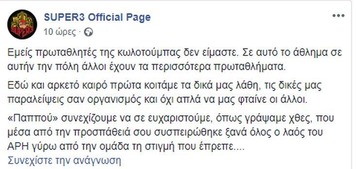Οι δηλώσεις του Πάκο Ερέρα, με τις οποίες είπε ότι ο Άρης είναι πιο μικρός από ΠΑΟΚ, ΑΕΚ, Ολυμπιακό και τις οποίες στη συνέχεια διόρθωσε, προκάλεσαν την αντίδραση του Super 3. Μέσω ανάρτησης στην επίσημη σελίδα τους στο Facebook και σε… θεσσαλονικιό ύφος, ο μεγαλύτερος σύνδεσμος οργανωμένων οπαδών του Άρη, αφού πρώτα ευχαριστεί τον «παππού» (όπως χαρακτηρίζει τον Ισπανό τεχνικό), στη συνέχεια αναφέρει ότι είναι δικό τους λάθος -οπαδών και επιτελικών στελεχών της ομάδας- που δεν τον έκαναν να καταλάβει σε ποιον σύλλογο βρέθηκε. Επίσης, εξαπολύουν «καρφιά» εναντίον του ΠΑΟΚ, στον οποίον καταλογίζουν έπαρση, όπως και στους δημοσιογράφους που τον υποστηρίζουν, λέγοντας χαρακτηριστικά ότι «η… Λεγανές (ο Άρης) έχει ένα παραπάνω πρωτάθλημα από την… Μπαρτσελόνα (ΠΑΟΚ)». Αναλυτικά η ανακοίνωση του Super 3: «Εμείς πρωταθλητές της κωλοτούμπας δεν είμαστε. Σε αυτό το άθλημα σε αυτήν την πόλη άλλοι έχουν τα περισσότερα πρωταθλήματα. Εδώ και αρκετό καιρό πρώτα κοιτάμε τα δικά μας λάθη, τις δικές μας παραλείψεις σαν οργανισμός και όχι απλά να μας φταίνε οι άλλοι. “Παππού” συνεχίζουμε να σε ευχαριστούμε, όπως γράψαμε χθες, που μέσα από την προσπάθειά σου συσπειρώθηκε ξανά όλος ο λαός του ΑΡΗ γύρω από την ομάδα τη στιγμή που έπρεπε. Σύμφωνα με τις σημερινές σου δηλώσεις παρομοιάζοντας τον ΑΡΗ με την Λεγανές και τους 3 τελευταίους αντιπάλους με την Ατλέτικο, την Μπαρτσελόνα και τη Ρεάλ πιστεύουμε ότι δεν φταις εσύ για αυτό. Φταίμε εμείς, φταίνε οι άνθρωποι που σε πλαισίωσαν ΑΝ δεν σου είπανε ότι η ομάδα που βρίσκεσαι, πριν από ορισμένα χρόνια και πριν περάσει την περιπέτεια που πέρασε, κέρδισε 2 φορές και απέκλεισε την Ατλέτικο Μαδρίτης. Φταίμε εμείς ΑΝ δεν σου είπαμε ότι η ομάδα που ηγείσαι απέκλεισε τη Σαραγόσα σε 2 νοκ άουτ αγώνες του Europa League πριν από τους ομίλους. Φταίμε εμείς ΑΝ δεν σου δώσαμε να καταλάβεις ότι κάθεσαι στον πάγκο της μόνης ομάδας που απέκλεισε ισπανική ομάδα από ευρωπαϊκή διοργάνωση. Φταίμε εμείς ΑΝ δεν σε είπαμε ότι η ομάδα με τα ασπρόμαυρα που συνάντησες δεν είναι η Μπαρτσελόνα αλλά είναι μία ομάδα με ένα πρωτάθλημα λιγότερο από τον ΑΡΗ. Φταίμε εμείς αν δεν σε δώσαμε να καταλάβεις ότι ο κόσμος αυτής της ομάδας μετά την περιπέτειά που τράβηξε έχει ανάγκη να δει την ομάδα του υπερήφανα να πρωταγωνιστεί έστω και με παράλογες απαιτήσεις για τη χρονική στιγμή που ανέλαβες. Αν όλα τα παραπάνω δεν στα είπε κανείς και δεν προσπάθησε να σε βάλει στην ψυχή και στην προσμονή αυτού του κόσμου φταίμε εμείς. Αν στα είπανε και λόγω της φιλοσοφίας και της κουλτούρας σου σαν άνθρωπος δεν μπόρεσες να καταλάβεις, όλα καλά. Δεν θα σε ρίξουμε καμία ευθύνη και κρατάμε μόνο τα θετικά. Σαν λαός ξέρουμε η ομάδα που λατρεύουμε σε ποια καμπή της ιστορίας της βρίσκεται αυτή τη στιγμή. Έχουμε ωριμάσει σαν ομάδα και σαν λαός και δεν έχουμε ανάγκη να φουσκώσουμε χαρακτηρίζοντας μας κάποιος Μπαρτσελόνα για να μας χαϊδέψει τα αυτιά ούτε να απογοητευτούμε αν μας παρομοιάσει με μία μικρή ομάδα της Ισπανίας. Έχει πλάκα πάντως που μετά τις συγκεκριμένες δηλώσεις κάποιοι αισθανθήκανε η Μπαρτσελόνα της Μακεδονίας.Δεν θα τους χαλάσουμε το χατίρι έστω και με ένα πρωτάθλημα λιγότερο από την Λεγανές. Δημοσιογράφοι της πόλης και ραδιοφωνικοί παραγωγοί που υποστηρίζουν την συγκεκριμένη ομάδα, μέσα από την έπαρση που τους χαρακτηρίζει τα τελευταία χρόνια λόγω νεοπολουτισμού φούσκω