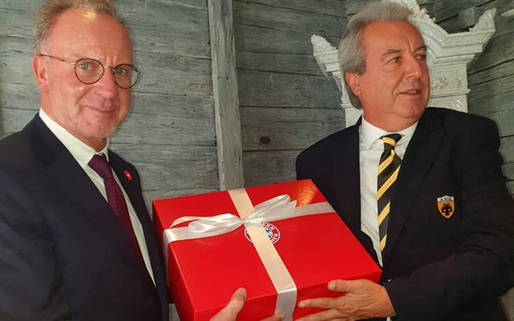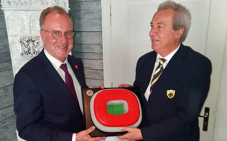 Το καθιερωμένο επίσημο γεύμα/δείπνο μεταξύ των διοικητικών στελεχών των ομάδων παρέθεσαν οι άνθρωποι της Μπάγερν Μονάχου σε αυτούς της ΑΕΚ, με τον Καρλ Χάιντς Ρουμενίγκε να είναι ο επικεφαλής από πλευράς Βαυαρών. Μάλιστα, στην εκδήλωση που πραγματοποιήθηκε σε εστιατόριο του Μονάχου, με την οποία οι άνθρωποι της Μπάγερν ανταπέδωσαν τη φιλοξενία αυτών της Ένωσης, η υποδοχή της ελληνικής αποστολής έγινε με τον ύμνο της ομάδας, παιγμένο στο πιάνο. Ο καλλιτέχνης δεν ήξερε ακριβώς τα λόγια του «κιτρινόμαυρου» ύμνου, ωστόσο δεν έχασε νότα, ενώ τραγούδησε και το «νικήστε, νικήστε, νικήστε», έστω και με τη δική του χαρακτηριστική προφορά. Δείτε το βίντεο και εικόνες από το γεύμα:
