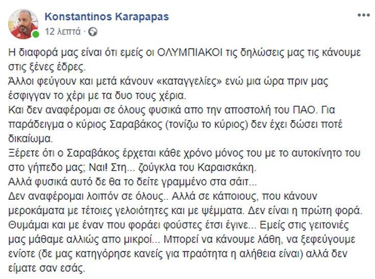 Συγκεκριμένα, ο Κώστας Καραπαπάς κατηγορεί τους ανθρώπους του Παναθηναϊκού πως έφυγαν από το Καραϊσκάκη και μετά «κάνουν «καταγγελίες» ενώ μια ώρα πριν μας έσφιγγαν το χέρι με τα δυο τους χέρια», μια στάση που -όπως τονίζει- δεν είναι πρωτόγνωρη για εκείνον, καθώς «θυμάμαι και με έναν που φοράει φούστες έτσι έγινε…».