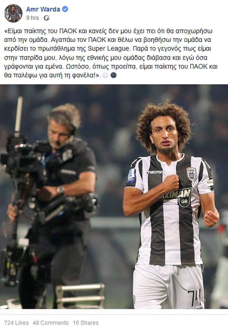 Στην Αίγυπτο, για τις υποχρεώσεις του αντιπροσωπευτικού συγκροτήματος της χώρας του βρίσκεται ο Αμρ Ουάρντα. Από εκεί έστειλε μήνυμα σε άπταιστα ελληνικά, μέσω Facebook, μέσω του οποίου απαντάει στην έντονη φημολογία που έχει δει το φως της δημοσιότητας και τον θέλει να αποτελεί παρελθόν από τον ΠΑΟΚ.