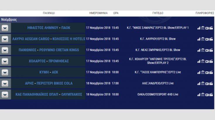 Την Κυριακή 18/11 οι δύο αναμετρήσεις που ολοκληρώνουν το πρόγραμμα έχουν ξεχωριστό ενδιαφέρον. Το αήττητο Περιστέρι ταξιδεύει στην Θεσσαλονίκη για να αντιμετωπίσει τον Άρη, ενώ στις 18:00 o Παναθηναϊκός φιλοξενεί στο ΟΑΚΑ τον Ολυμπιακό για την «μάχη» του πρωταθλήματος.