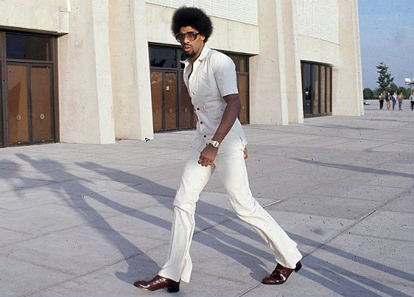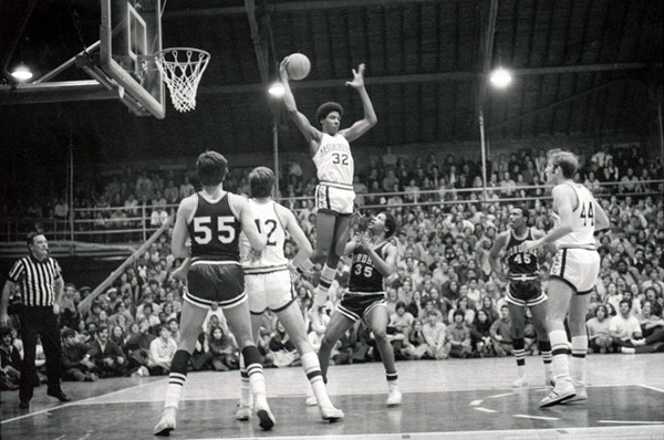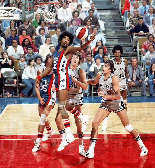 Ο Dr. J αρπάζει ένα rebound στους αιθέρες για λογαριασμό της ομάδας του, το Πανεπιστήμιο της Μασαχουσέτης…