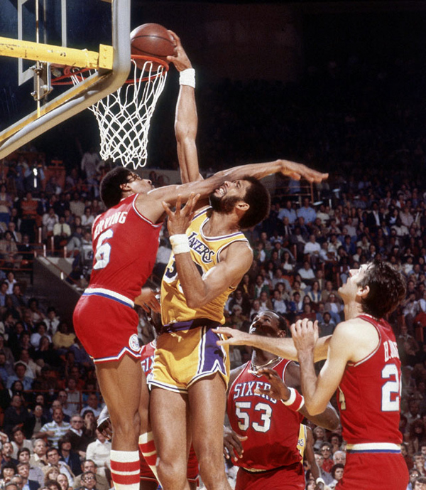 Ο Kareem Abdul Jabbar καρφώνει στη μούρη του Erving, του παίκτη που συνήθιζε να καρφώνει αυτός στις μούρες των άλλων!