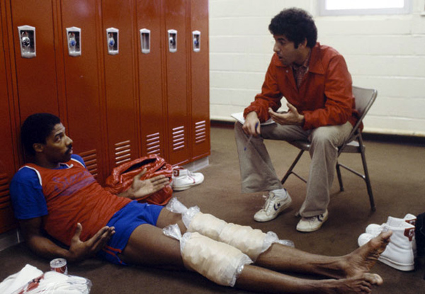 Ο προπονητής των Sixers τα λέει ένα χεράκι με τον Erving στα αποδυτήρια.