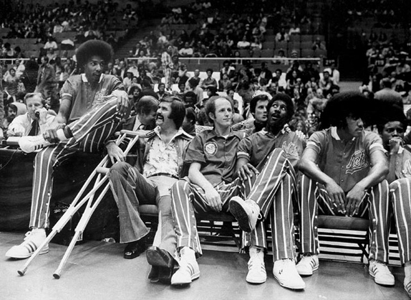 Ο Erving (τέρμα αριστερά) κάθεται στον πάγκο με τους συμπαίκτες του.