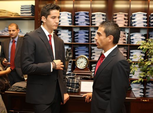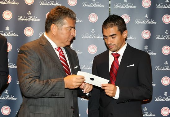O Κωνσταντίνος Τσουβελεκάκης, Διευθύνων Σύμβουλος της Brooks Brothers, παραδίδει στον Ariel Ibagaza την κάρτα μέλους του Brooks Brothers VIP Club