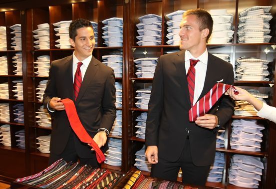 Οι παίκτες του Ολυμπιακού στο flagship store της Brooks Brothers, έχοντας μόλις ολοκληρώσει τις αγορές τους