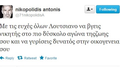 «Με τις ευχές όλων Λουτσιάνο να βγεις νικητής στον πιο δύσκολο αγώνα της ζωής σου και να γυρίσεις δυνατός στην οικογένεια σου», έγραψε στο twitter o Αντώνης Νικοπολίδης.