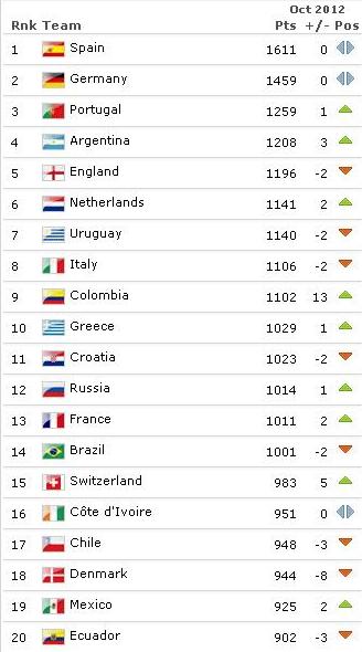 Στην κορυφή του σχετικού πίνακα παραμένει η Ισπανία, δεύτερη είναι η Γερμανία και στην τρίτη φιγουράρει πλέον η Πορτογαλία. Επίσης, η Αργεντινή σημείωσε άνοδο τριών θέσεων και πλέον είναι τέταρτη.