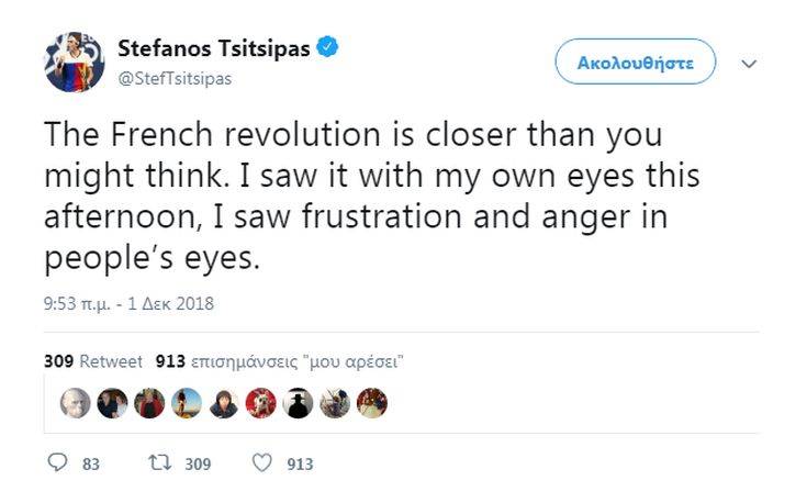 Ο 20χρόνος Έλληνας τενίστας έγραψε σε tweet του: «Η γαλλική επανάσταση είναι πιο κοντά από ό,τι μπορεί να νομίζετε. Το είδα με τα ίδια μου τα μάτια το απόγευμα. Είδα εκνευρισμό και οργή στα μάτια του κόσμου».