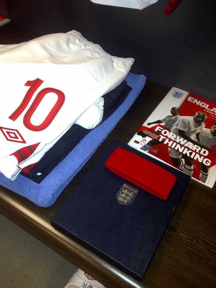 Δεν μπορεί να περιμένει και το δείχνει! Ο Γουέιν Ρούνεϊ θα ηγηθεί των συμπαικτών του στο σημερινό παιχνίδι με το Σαν Μαρίνο στο «Γουέμπλεϊ» και… προβάρει το περιβραχιόνιο του αρχηγού στα αποδυτήρια του γηπέδου!
