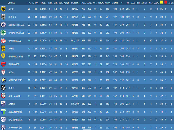 Πιο συγκεκριμένα, ο Ολυμπιακός έχει 18 γκολ με ποσοστό 8,7% τέρματα/τελικές προσπάθειες, έχοντας δοκιμάσει τους αντίπαλους τερματοφύλακες 207 φορές. Ο ΠΑΟΚ, από την πλευρά του, έχει ποσοστό 15,3% (144 τελικές), ο Ατρόμητος 16,9% (130 τελικές), η ΑΕΚ έχει 14,8% (148 τελικές) και ο Παναθηναϊκός 16,8% (131 τελικές). Μάλιστα, το σύνολο του Πέδρο Μαρτίνς μετρά και οκτώ δοκάρια, όντας πίσω μόνο από την «απόλυτη» ΑΕΚ με 13 (1 δοκάρι ανά ματς μέσο όρο) και τον Άρη με 9.