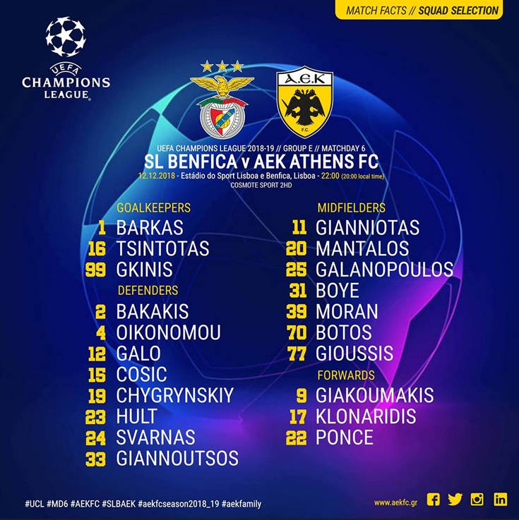 Στην αποστολή για τον αγώνα με την Μπενφίκα βρίσκονται οι: Μπάρκας, Τσιντώτας, Γκίνης, Μπακάκης, Οικονόμου, Γκάλο, Τσόσιτς, Τσιγκρίνσκι, Χουλτ, Σβάρνας, Γιαννούτσος, Κλωναρίδης, Μάνταλος, Γαλανόπουλος, Μοράν, Μπότος, Γιούσης, Γιακουμάκης, Γιαννιώτας, Πόνσε, Μπογιέ.