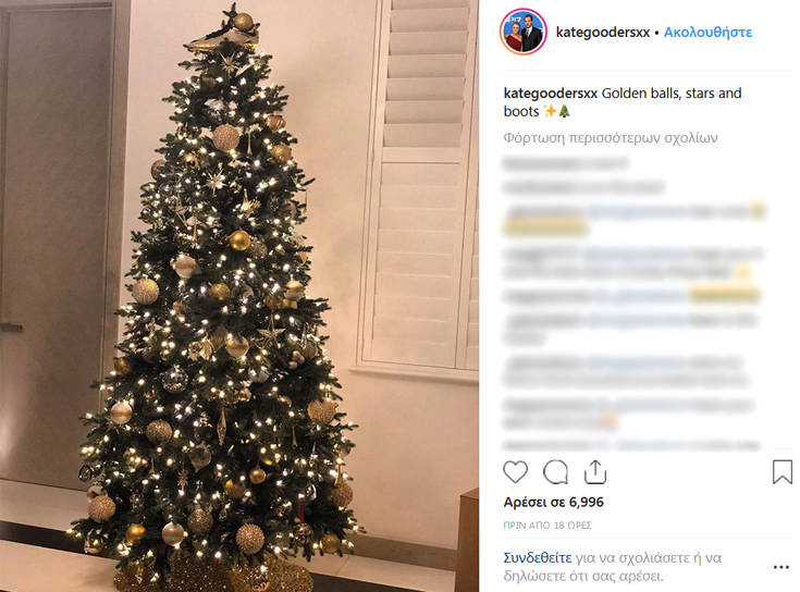 Την αποκάλυψη έκανε η σύζυγός του, Κέιν, Κέιτ Γκούντλαντ, με μια ανάρτησή της στο προσωπικό της προφίλ στο Instagram. Στη φωτογραφία εμφανίζεται το χρυσό παπούτσι στην κορυφή του δέντρου, στη θέση που παραδοσιακά βρίσκεται το αστέρι. «Χρυσές μπάλες, αστέρια και παπούτσια», ήταν η λεζάντα με την οποία συνόδευσε την εικόνα.