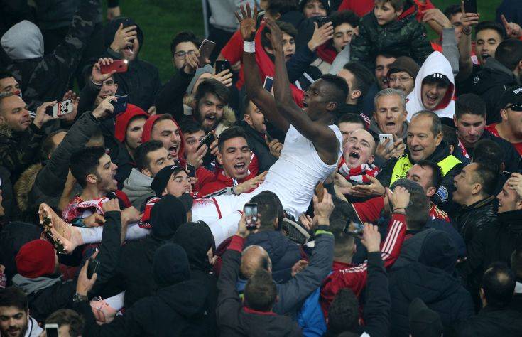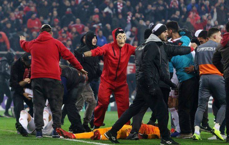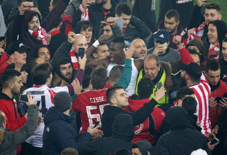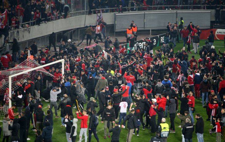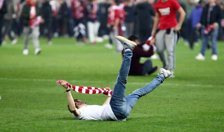 Εκατοντάδες οπαδοί του Ολυμπιακού μπήκαν στον αγωνιστικό χώρο του «Γ. Καραϊσκάκης» μετά το σφύριγμα της λήξης της αναμέτρησης για να πανηγυρίσουν την μεγάλη πρόκριση επί της Μίλαν στους «32» του Europa League.