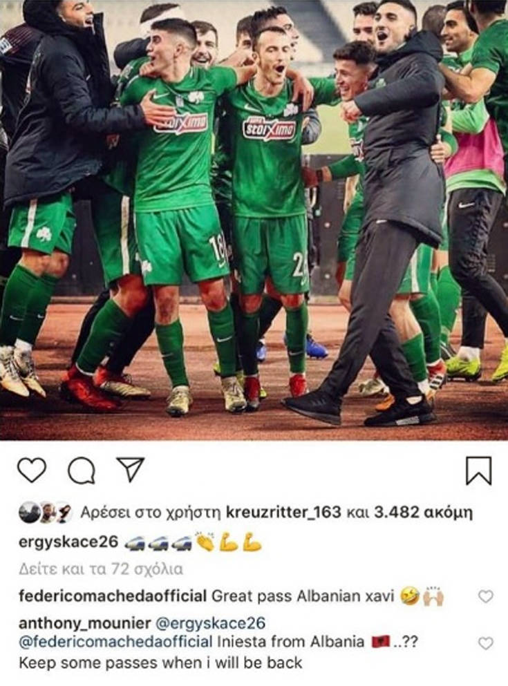 «Υπέροχη πάσα από τον Αλβανό Τσάβι», ανέφερε ο Μακέντα. «Ινιέστα από την Αλβανία. Kράτα μερικές ακόμη πάσες για όταν θα επιστρέψω», ήταν το σχόλιο του Μουνιέ, κάτω από τη φωτογραφία που ανέβασε στον προσωπικό του λογαριασμό ο Κάτσε.