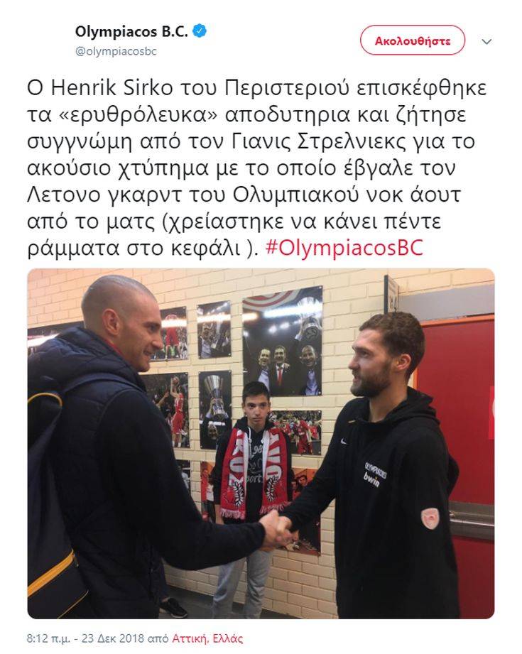 Ο Χένρικ Σίρκο επισκέφθηκε μετά το τέλος του αγώνα τα αποδυτήρια του Ολυμπιακού προκειμένου να ζητήσει συγνώμη από τον Γιάνις Στρέλνιεκς.