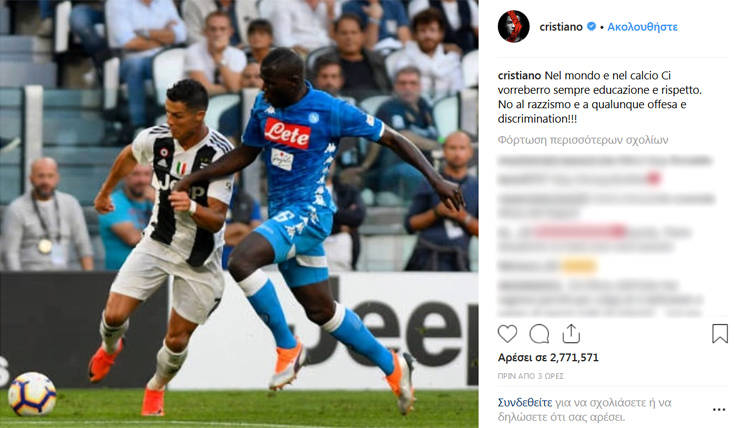Ο Πορτογάλος αστέρας ανέβασε στον προσωπικό του λογαριασμό στο Instagram μια φωτογραφία στην οποία εμφανίζεται να «μονομαχεί» για την μπάλα με τον Κουλιμπαλί και την οποία συνόδευσε με την εξής λεζάντα: «Στον κόσμο και στο ποδόσφαιρο πάντα επιθυμώ παιδεία και σεβασμό. Όχι στον ρατσισμό και σε κάθε διάκριση».