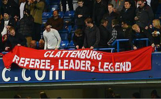 Παραλλάσσοντας, λοιπόν, το πανό των «μπλε» για τον Τζον Τέρι «JT, captain, leader, legend», οι «διάβολοι» σήκωσαν ένα πανό που ανέφερε «Clattenburg, referee, leader, legend» (διαιτητής, ηγέτης, θρύλος).