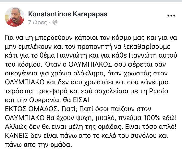Για να μη μπερδεύουν κάποιοι τον κόσμο μας και για να μην εμπλέκουν και τον προπονητή να ξεκαθαρίσουμε κάτι για το θέμα Γιαννιώτη και για κάθε Γιαννιώτη αυτού του κόσμου. Όταν ο ΟΛΥΜΠΙΑΚΟΣ σου φέρεται σαν οικογένεια για χρόνια ολόκληρα, όταν χρωστάς στον ΟΛΥΜΠΙΑΚΟ και δεν σου χρωστάει και σου κάνει μια τεράστια προσφορά και εσύ ασχολείσαι με τη Ρωσία και την Ουκρανία, θα ΕΙΣΑΙ ΕΚΤΟΣ ΟΜΑΔΟΣ. Γιατί; Γιατί όσοι παίζουν στον ΟΛΥΜΠΙΑΚΟ θα έχουν ψυχή, μυαλό, πνεύμα 100% εδώ! Αλλιώς δεν θα είναι μέλη της ομάδας. Είναι τόσο απλό! ΚΑΝΕΙΣ δεν είναι πάνω από το καλό του συνόλου και πάνω από την ομάδα.