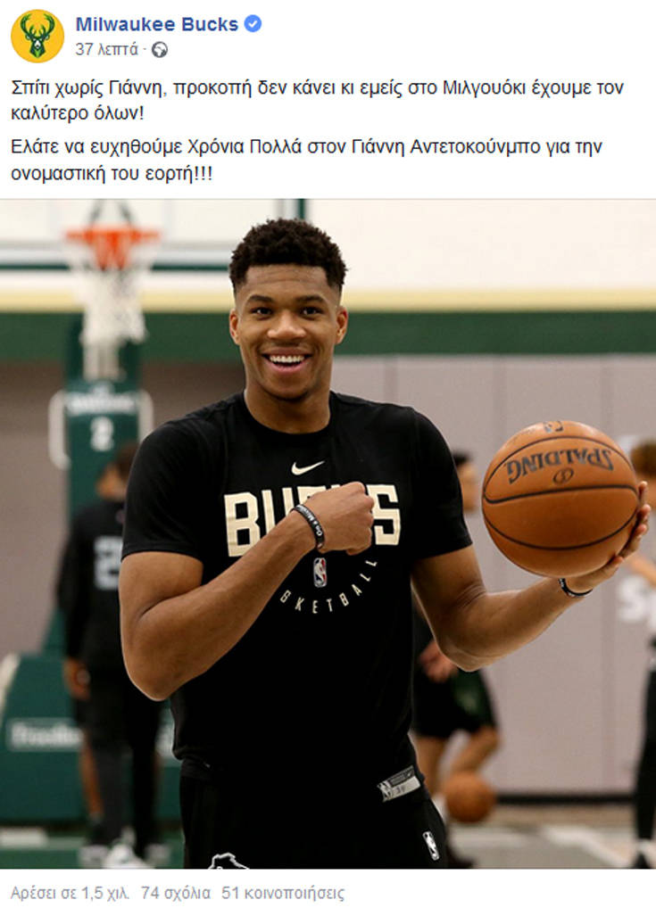 Ο Γιάννης Αντετοκούνμπο έχει σήμερα την ονομαστική του εορτή και οι Μιλγουόκι Μπακς δεν τον ξέχασαν. Με μια ανάρτησή τους στα social media, στα ελληνικά, τα «ελάφια» ευχήθηκαν στο μεγάλο τους αστέρι, χρησιμοποιώντας μάλιστα και ένα ελληνικό ρητό.