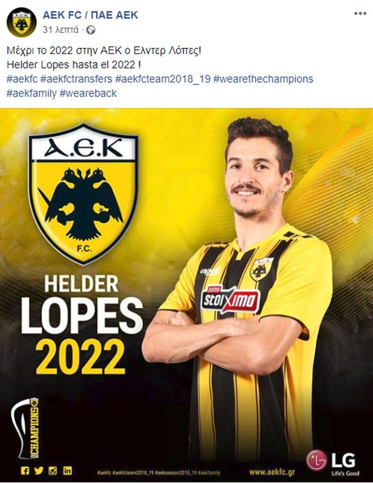 «Η ΠΑΕ ΑΕΚ ανακοινώνει την ανανέωση του συμβολαίου του Έλντερ Λόπες. Ο Πορτογάλος ακραίος αμυντικός θα συνεχίσει να φορά τη φανέλα της ομάδας μας τουλάχιστον έως το καλοκαίρι του 2022.