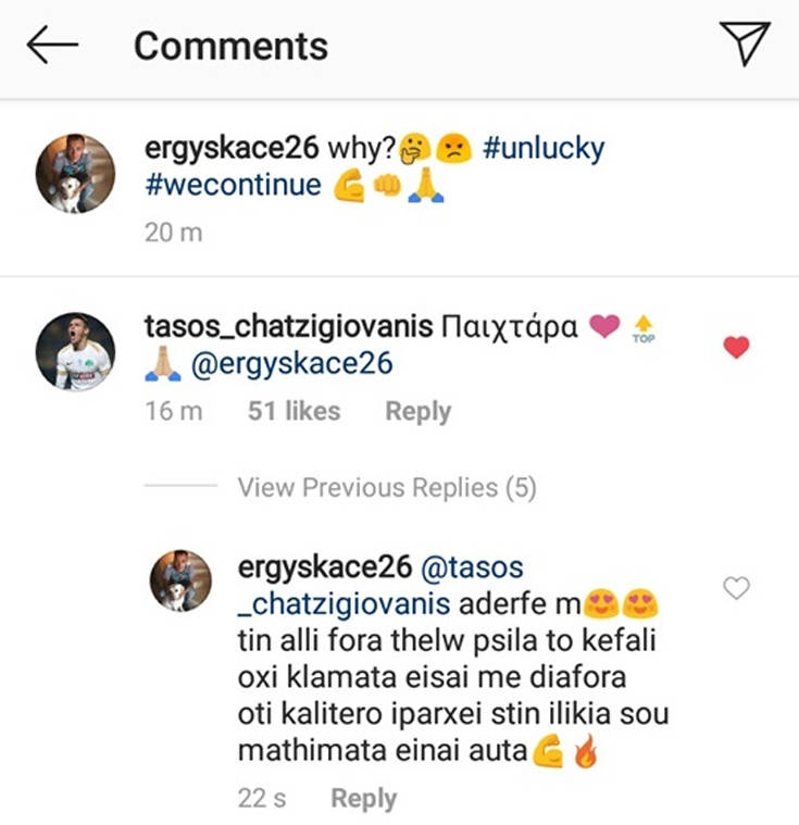 Ο Έργκους Κάτσε ανάρτησε στον λογαριασμό του στο Instagram το δοκάρι που είχε από μεγάλη απόσταση, όταν το παιχνίδι ήταν στο 2-1, συνοδεύοντας το βίντεο με τη λεζάντα «άτυχος». Ο Χατζηγιοβάνης χαρακτήρισε τον Αλβανό συμπαίκτη του «παιχταρά», με εκείνον να απαντά στον νεαρό άσο: «Αδερφέ μου, την άλλη φορά θέλω ψηλά το κεφάλι, όχι κλάματα. Είσαι με διαφορά ό,τι καλύτερο υπάρχει στην ηλικία σου. Μαθήματα είναι αυτά».