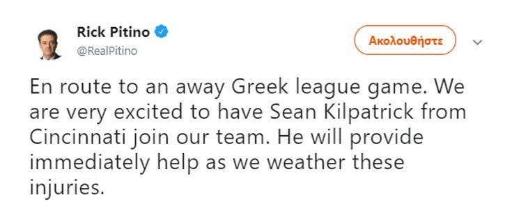 «Στον δρόμο για εκτός έδρας παιχνίδι του ελληνικού πρωταθλήματος. Είμαστε πολύ ενθουσιασμένοι που έχουμε τον Σον Κιλπάτρικ από το Σινσινάτι, ο οποίος βρέθηκε στην ομάδα μας. Θα μας βοηθήσει άμεσα από τη στιγμή που έχουμε αυτούς τους τραυματισμούς», ήταν το μήνυμα μέσω Twitter από τον έμπειρο τεχνικό του «τριφυλλιού», λίγη ώρα πριν την αναμέτρηση στην Εύβοια.