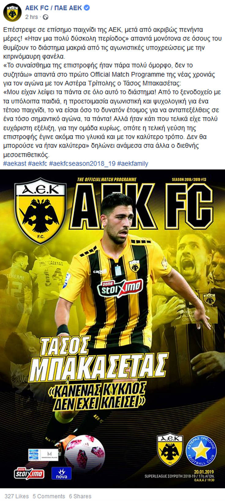 Ο Τάσος Μπακασέτας είναι ο παίκτης της ΑΕΚ που μίλησε στο match programme για το προσεχές παιχνίδι με αντίπαλο τον Αστέρα Τρίπολης, με τον διεθνή μεσοεπιθετικό να δηλώνει πως η επιστροφή του στα πεπραγμένα της ομάδας , δεν θα μπορούσε να είναι καλύτερη, «διπλό» στα Γιάννενα.