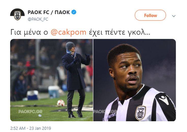 Σήμερα, ο επίσημος ΠΑΟΚ, μέσω του λογαριασμού του στο Twitter, σχολίασε με δηκτικό τρόπο το… ρεκόρ που έχει ο Άκπομ με ακυρωθέντα τέρματα, καθώς «ανέβασε» μια διπλή φωτογραφία στην οποία εμφανίζονται ο Λουτσέσκου και ο Άγγλος φορ και η οποία συνοδεύται με την εξής λεζάντα: «Για μένα ο Άκπομ έχει πέντε γκολ».