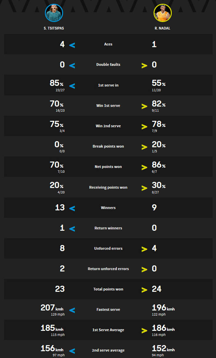 Τα στατιστικά μέχρι την ώρα που το παιχνίδι ήταν στο 4-4, έδειχναν την απόλυτη ισορροπία σε κερδισμένους πόντους μεταξύ Τσιτσιπά και Ναδάλ, αλλά και πάλι ο Ισπανός είχε λιγότερα αβίαστα λάθη από τον νεαρό Έλληνα. Επίσης, το 55% επιτυχίας του στο πρώτο σερβίς, σε σχέση με το 85% του νεαρού συμπατριώτη μας, δείχνει πόσο πολύ πίεζε για να τα εκμαιεύσει…