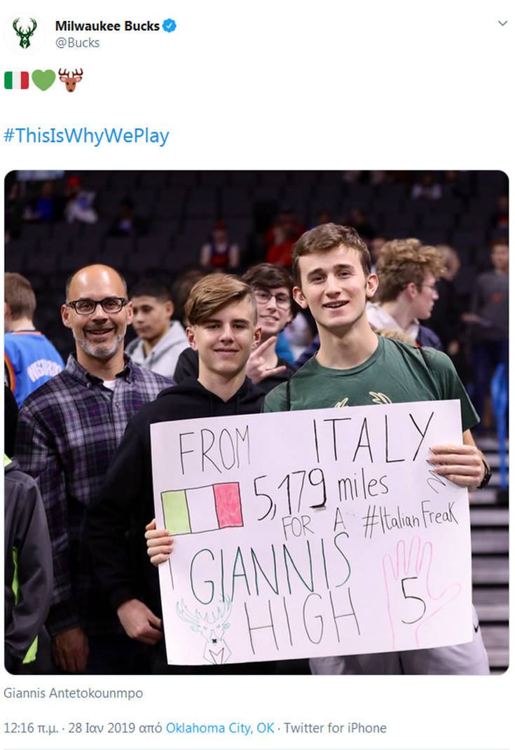 Οι συγκεκριμένοι δύο Ιταλοί, ταξίδεψαν από τη χώρα τους μέχρι την «καρδιά» των ΗΠΑ, για να δουν από κοντά τον αγαπημένο τους παίκτη. Μάλιστα, φρόντισαν να κάνουν έντονη την παρουσία τους στο γήπεδο, με πλακάτ που έγραφε «5,179 μίλια για ένα high five με τον Γιάννη».