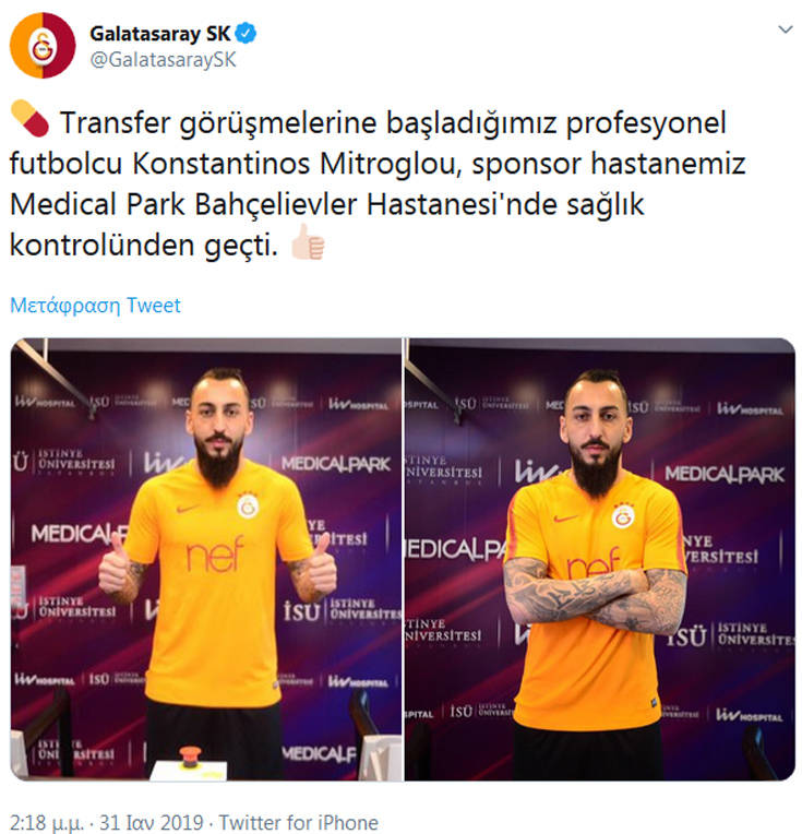 Παίκτης της Γαλατάσαραϊ θα είναι μέχρι το καλοκαίρι του 2020 ο Κώστας Μήτρογλου. Ο 30χρονος Έλληνας στράικερ ανακοινώθηκε και επίσημα από την ομάδα της Κωνσταντινούπολης και πόζαρε με τη φανέλα της, στην καθιερωμένη φωτογράφιση.