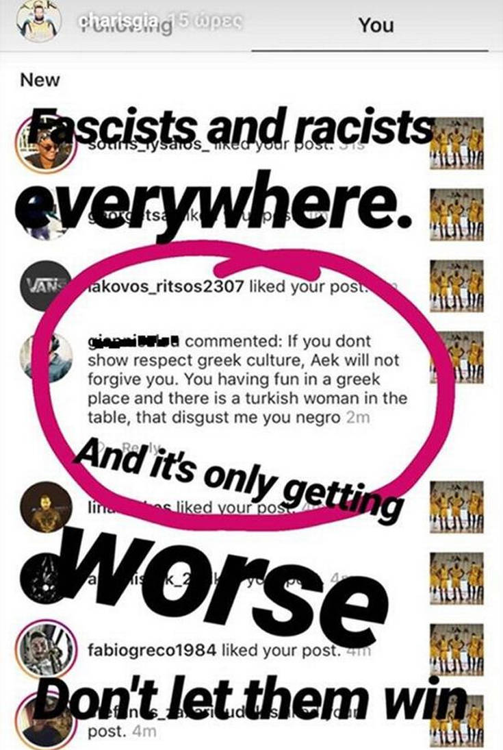 Ο αθλητής φρόντισε να ενημερώσει τους υπολοίπους ακόλουθούς του στα social media για το ρατσιστικό σχόλιο, τονίζοντας ότι «ένας Έλληνας είναι θυμωμένος μαζί του μόνο και μόνο γιατί έχει σύζυγο από την Τουρκία». Πολλοί ήταν οι συνάδελφοί του που σχολίασαν το όλο σκηνικό, με τον ίδιο να αναφέρει: «Ρατσιστές και εδώ. Κουνάω με απογοήτευση το κεφάλι μου».