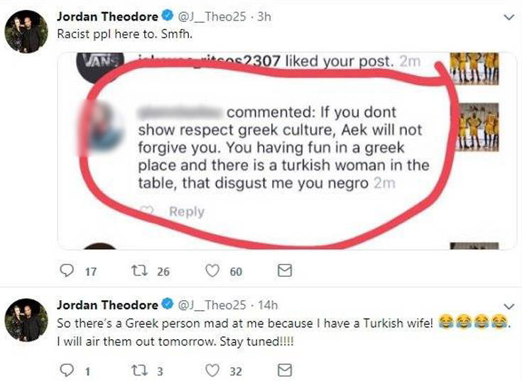 Ο Αμερικανός μπασκετμπολίστας «ανέβασε» μια φωτογραφία μαζί με τη σύζυγό του, η οποία είναι από την Τουρκία και παίζει μπάσκετ στη Γαλατάσαραϊ. Ένας διαδικτυακός… φίλος του Θίοντορ, του έγραψε: «Αν δεν δείξει σεβασμό στην ελληνική κουλτούρα η ΑΕΚ δεν θα σε συγχωρέσει. Διασκεδάζεις σε ένα ελληνικό μέρος και υπάρχει μια γυναίκα από την Τουρκία στο τραπέζι, με αηδιάζεις νέγρο».