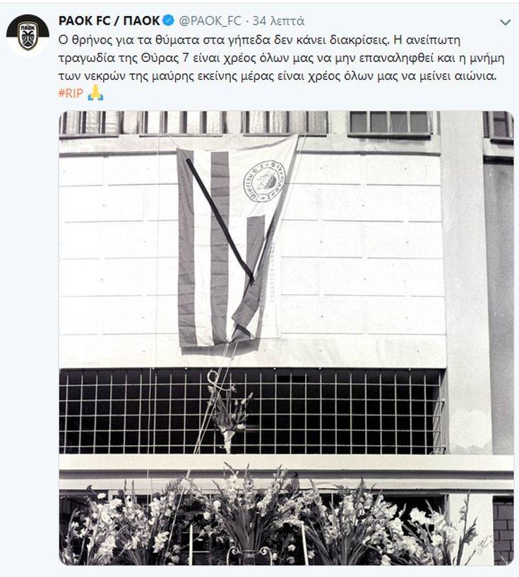 «Ο θρήνος για τα θύματα στα γήπεδα δεν κάνει διακρίσεις. Η ανείπωτη τραγωδία της Θύρας 7 είναι χρέος όλων μας να μην επαναληφθεί και η μνήμη των νεκρών της μαύρης εκείνης μέρας είναι χρέος όλων μας να μείνει αιώνια», αναφέρει χαρακτηριστικά.
