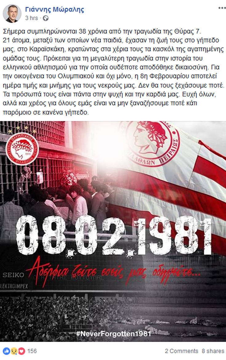 21 άτομα, μεταξύ των οποίων νέα παιδιά, έχασαν τη ζωή τους στο γήπεδο μας, στο Καραϊσκάκη, κρατώντας στα χέρια τους τα κασκόλ της αγαπημένης ομάδας τους. Πρόκειται για τη μεγαλύτερη τραγωδία στην ιστορία του ελληνικού αθλητισμού για την οποία ουδέποτε αποδόθηκε δικαιοσύνη. Για την οικογένεια του Ολυμπιακού και όχι μόνο, η 8η Φεβρουαρίου αποτελεί ημέρα τιμής και μνήμης για τους νεκρούς μας. Δεν θα τους ξεχάσουμε ποτέ. Τα πρόσωπά τους είναι πάντα στην ψυχή και την καρδιά μας. Ευχή όλων, αλλά και χρέος για όλους εμάς είναι να μην ξαναζήσουμε ποτέ κάτι παρόμοιο σε κανένα γήπεδο», αναφέρει ο κ. Μώραλης.