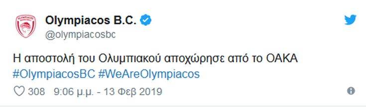 «Η αποστολή του Ολυμπιακού αποχώρησε από το ΟΑΚΑ», έγραψαν χαρακτηριστικά.