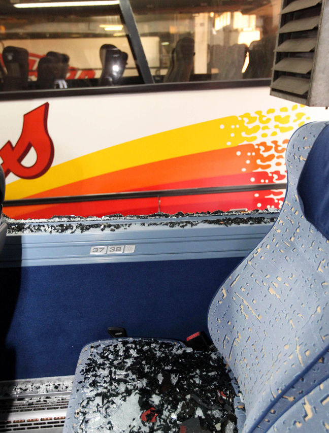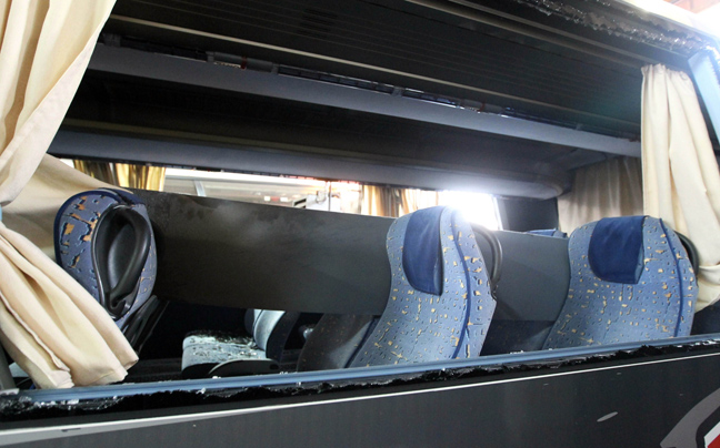 Από την επίθεση πήρε φωτιά το λεωφορείο και τραυματίστηκαν τέσσερα άτομα.