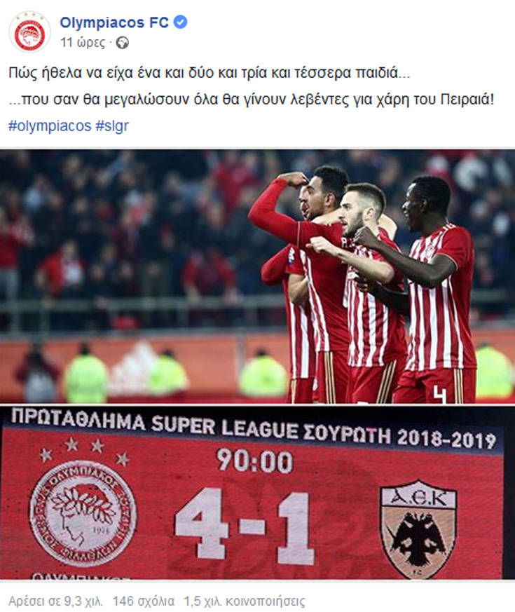 Στο Λιμάνι είχαν κάθε λόγο να είναι χαρούμενοι για την εξέλιξη του παιχνιδιού και τρόλαραν την Ένωση με το θρυλικό τραγούδι του Μάνου Χατζηδάκι «Τα παιδιά του Πειραιά». Ανάρτησαν μια πανηγυρική φωτογραφία μαζί με τα μάτριξ που έγραφαν το σκορ και ως λεζάντα έγραψαν τους στίχους: «Πώς ήθελα να είχα ένα και δύο και τρία και τέσσερα παιδιά…που σαν θα μεγαλώσουν όλα θα γίνουν λεβέντες για χάρη του Πειραιά!».