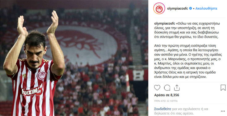 Ευχαριστώ όλους στον οργανισμό του Ολυμπιακού, όπως ευχαριστώ και όλη την ΟΙΚΟΓΕΝΕΙΑ του Ολυμπιακού, για το “τσουνάμι” αγάπης και στήριξης. Από τον κ. Μαρινάκη, μέχρι τον κόσμο που με βλέπει στον δρόμο και με πλησιάζει, για να μου ευχηθεί να γυρίσω γρήγορα. Αλλά και τους αμέτρητους φιλάθλους, που δεν είναι Ολυμπιακοί, αλλά έδειξαν ενδιαφέρον και μου ευχήθηκαν ταχεία ανάρρωση.