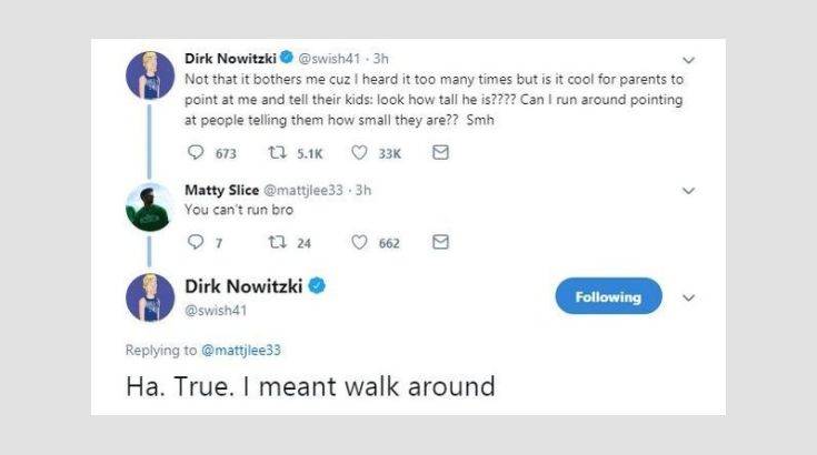 Ο Γερμανός φόργουορντ των Μάβερικς άρχισε την πλάκα στο Twitter, λέγοντας: «Όχι ότι με ενοχλεί, γιατί το έχω ακούσει πολλές φορές, αλλά είναι καλό που οι γονείς με δείχνουν και λένε στα παιδιά τους “βλέπεις πόσο ψηλός είναι;;;”. Μπορώ να τρέχω τριγύρω και να δείχνω τους άλλους λέγοντας πόσο κοντοί είναι;;;».