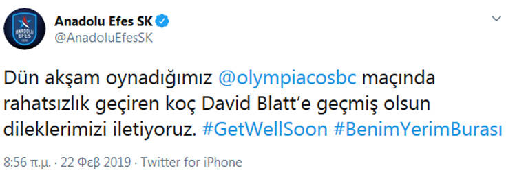 Μάλιστα, η Εφές, με ανάρτησή της στο Twitter ευχήθηκε περαστικά στον 59χρονο κόουτς και γρήγορη ανάρρωση.